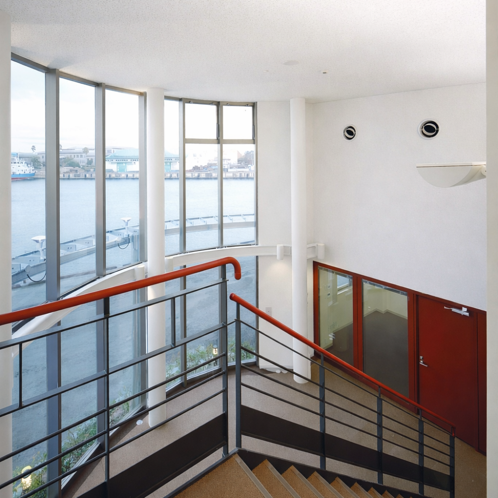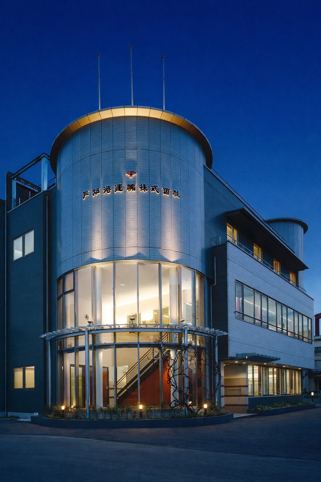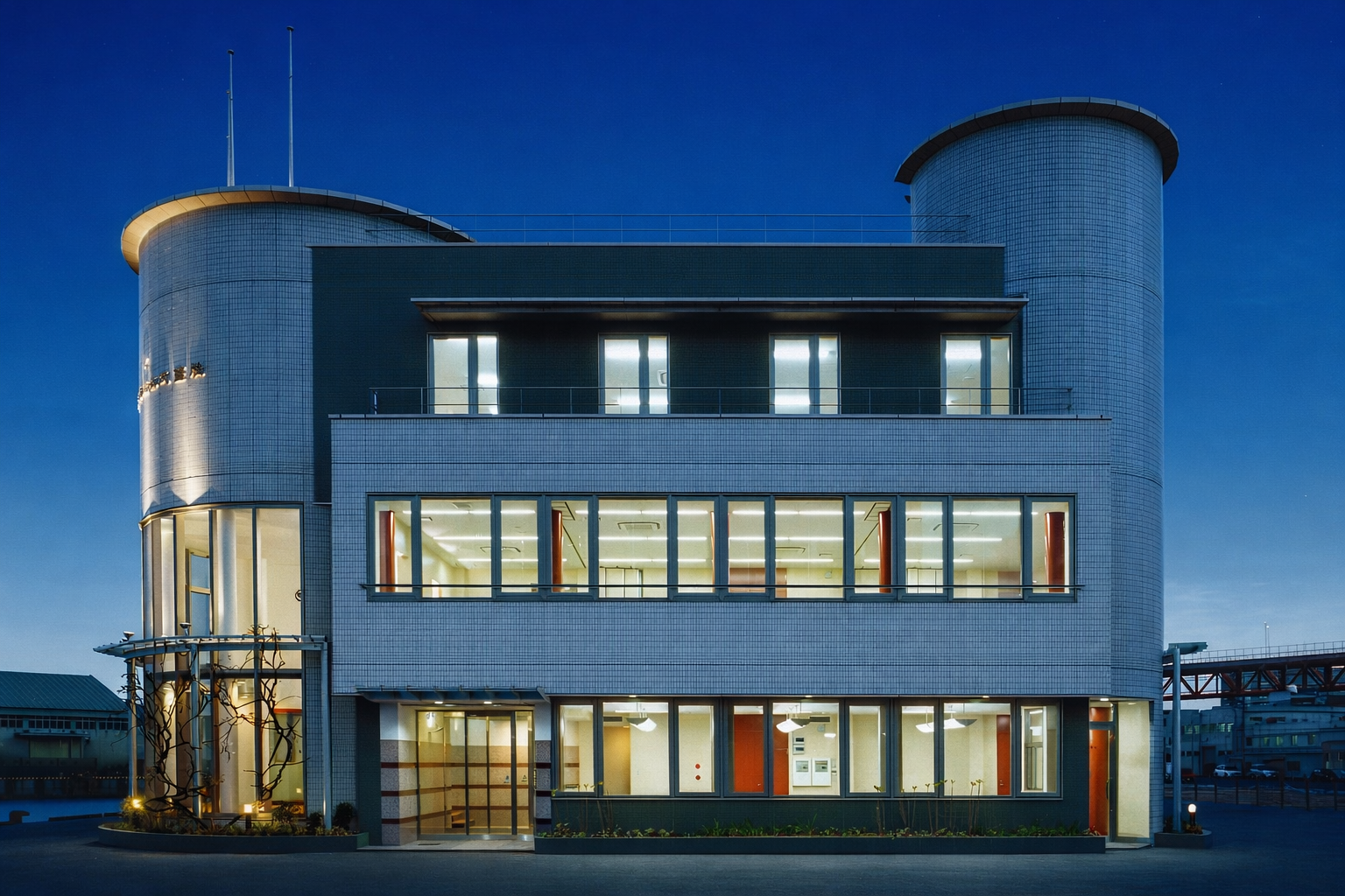 竣工年 2006年 作品名 戸畑港運輸本社ビル 場所 福岡県北九州市 用途建築基準法の分類 オフィスビル 構造 重量鉄骨造 階数 3階 コメント 本建築は港に面した立地特性を生かし、「港を照らす行灯」をイメージして計画した。円筒形のボリュームとガラス面を多用することで、内部の活動や気配が外部へやわらかく表出する構成としている。昼間は海や空を映し込み、港の風景と一体となる軽やかな佇まいを見せ、夜には内部の灯りが行灯のように港を照らす。機能性と象徴性を兼ね備え、港の景観に静かに寄り添う建築を目指した。