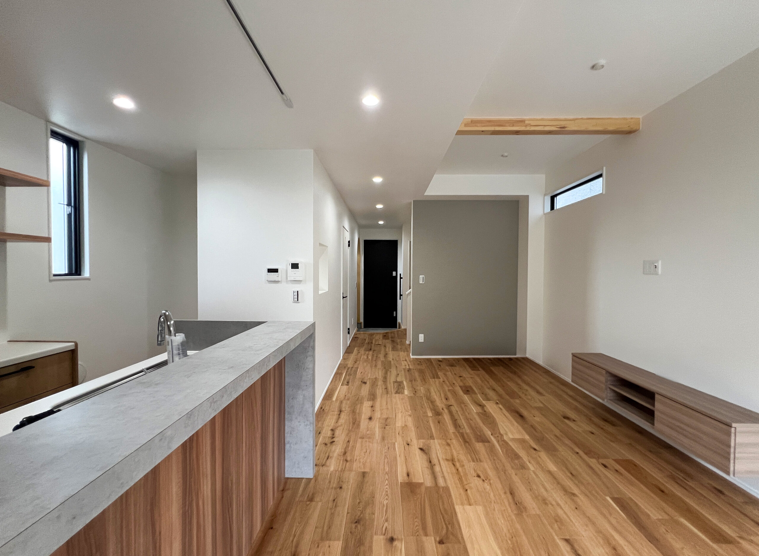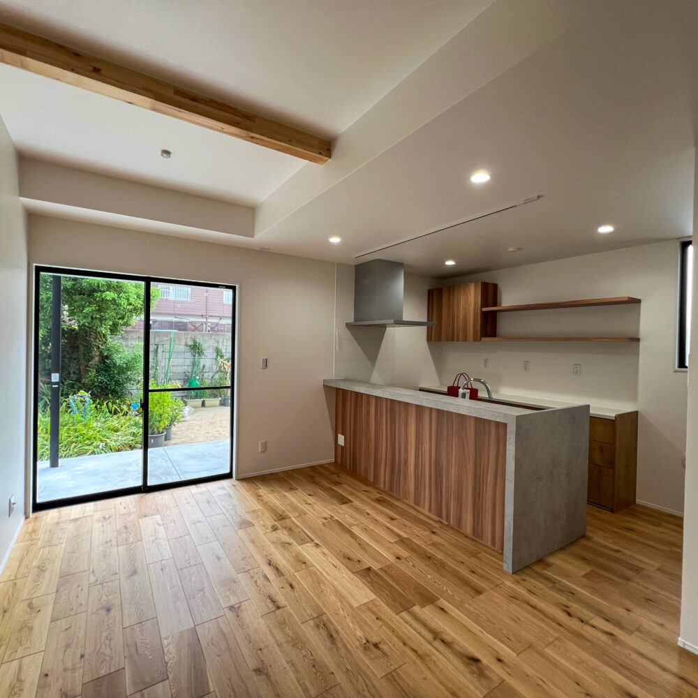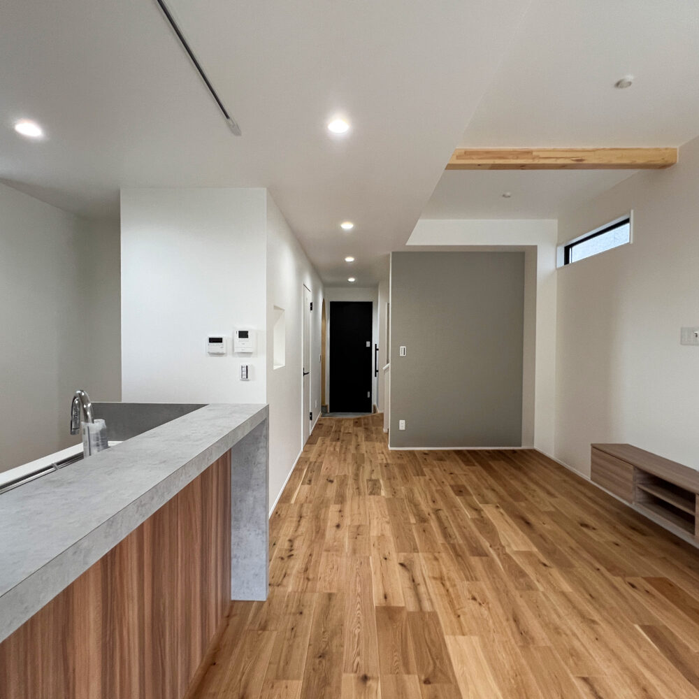 親子3人が、毎日を無理なく心地よく過ごせることを大切に計画した住まいです。家族が自然と集まる時間と、それぞれが自分の時間を大切にできる距離感の両立を意識し、空間のつながり方や配置を工夫しました。リビング・ダイニング・キッチンは一体感を持たせつつ、どこにいても落ち着ける居場所が生まれる構成としています。床や天井、造作家具には木のあたたかみを感じられる素材を取り入れ、暮らしの中で少しずつ愛着が深まる住まいを目指しました。玄関や水まわりには、使いやすさと片付けやすさを考えた収納と余白を設け、日常が自然と整う工夫をしています。